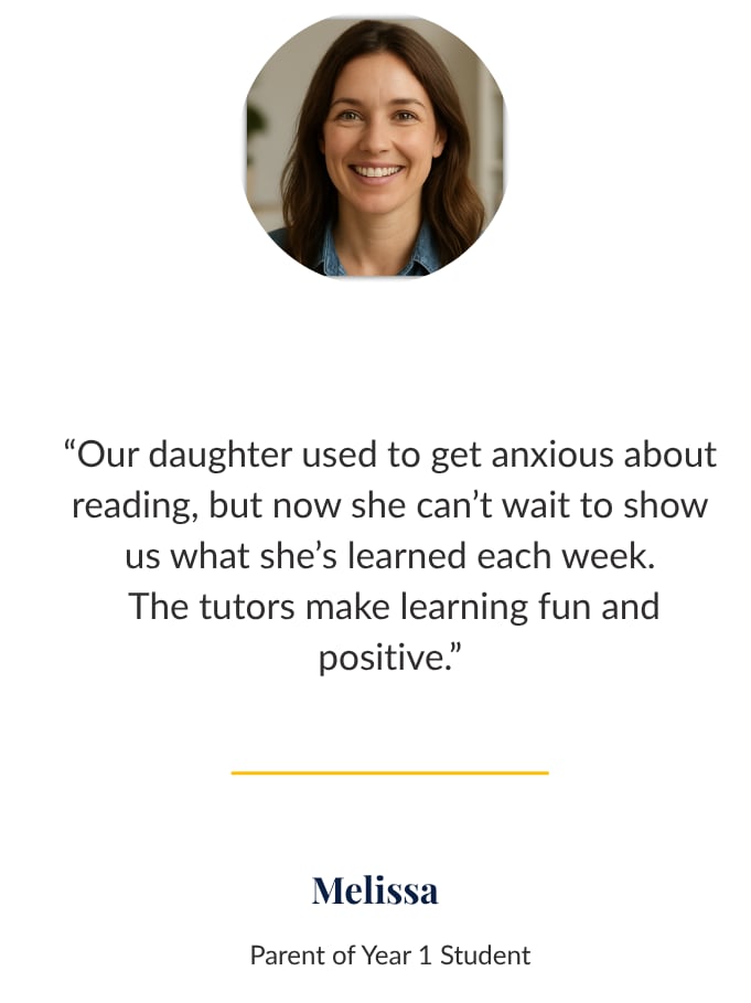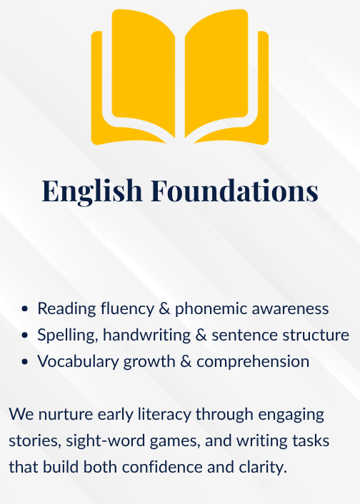 Each child learns differently, so our tutors tailor lessons to match your child’s pace and style. Whether it’s recognising sight words, improving handwriting, or mastering basic maths facts, we make sure every student feels capable and proud of their progress.