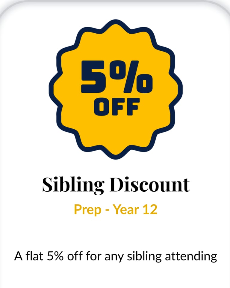 A 5% discount for families with more than one child enrolled from Prep to Year 12.